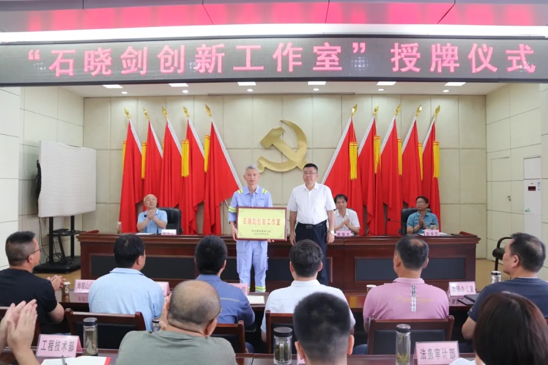 三樓會(huì)議室座無(wú)虛席,公司領(lǐng)導(dǎo)班子,機(jī)關(guān)部室負(fù)責(zé)人、基層單位分管領(lǐng)導(dǎo)及技術(shù)骨干、職工代表等40余人共同見(jiàn)證授牌時(shí)刻。湖北省首席工人技師、公司首席電氣工程師石曉劍進(jìn)行表態(tài)發(fā)言,公司黨委書記、董事長(zhǎng)、總經(jīng)理余曦親自將“石曉劍創(chuàng)新工作室”銅牌頒授到石曉劍手上。